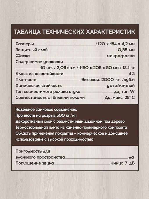 Способ монтажа "Механический замок" облегчит процесс укладки, а водостойкость позволит использовать его даже в помещениях с повышенной влажностью. Гибкость материала делает возможным использование ламината на неровных поверхностях. Особая толщина доски 4.2 мм гарантирует её прочность и износостойкость классом 42, что подходит для любых условий эксплуатации.