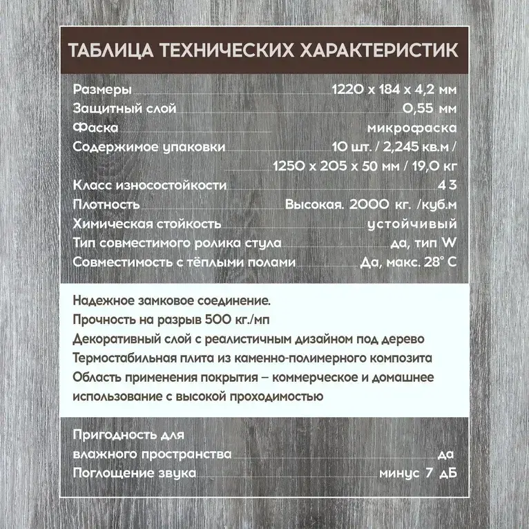 Способ монтажа "Механический замок" облегчит процесс укладки, а водостойкость позволит использовать его даже в помещениях с повышенной влажностью. Гибкость материала делает возможным использование ламината на неровных поверхностях. Особая толщина доски 4.2 мм гарантирует её прочность и износостойкость классом 42, что подходит для любых условий эксплуатации.