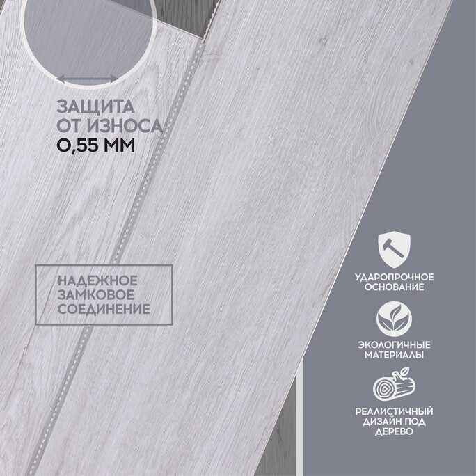 Бренд I-Floors гарантирует высокое качество и долговечность. В упаковке 10 штук, каждая доска имеет размеры 1120 мм х 184 мм x 4.2 мм с защитным слоем толщиной в 0.55 мм. Монтаж осуществляется с помощью простого и надежного замка, что позволяет быстро уложить ламинат самостоятельно.